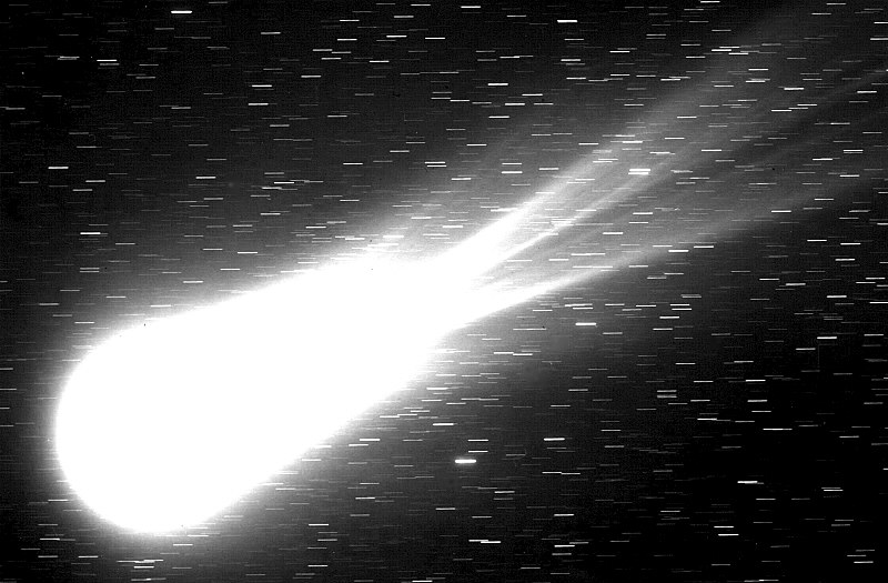 96B2-252.JPG: This image of comet C/1996 B2 (Hyakutake) was taken on March 25, 1996, by Erich Kolmhofer and Herbert Raab near Linz, Austria, using a 225mm f/2.0 Schmidt Camera. It is a ten minute exposure (23:10 - 23:20 UT) on hypered TP 6415 film. The field shown here is about 6.2 degrees wide, and north is left. Unlike in the image 96B2-251.JPG, taken about 23 hours before, the comet's tail appears very "quiet" here, with several prominent streamers.